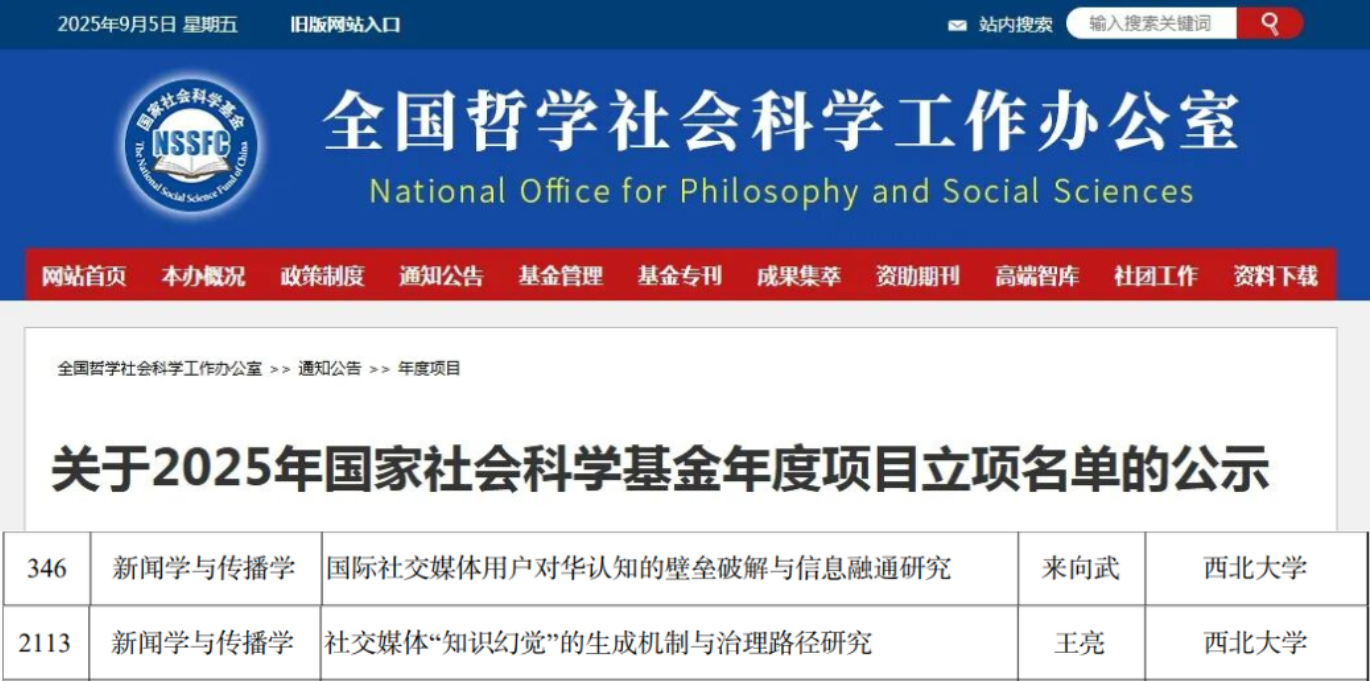 9月5日,全国哲学社会科学工作办公室公示了国家社会科学(国社科)基金年度项目立项名单。我院来向武教授申报的《国际社交媒体用户对华认知的壁垒破解与信息融通研究》获批重点项目,王亮教授申报的《社交媒体“知识幻觉”的生成机制与治理路径研究》获批一般项目。