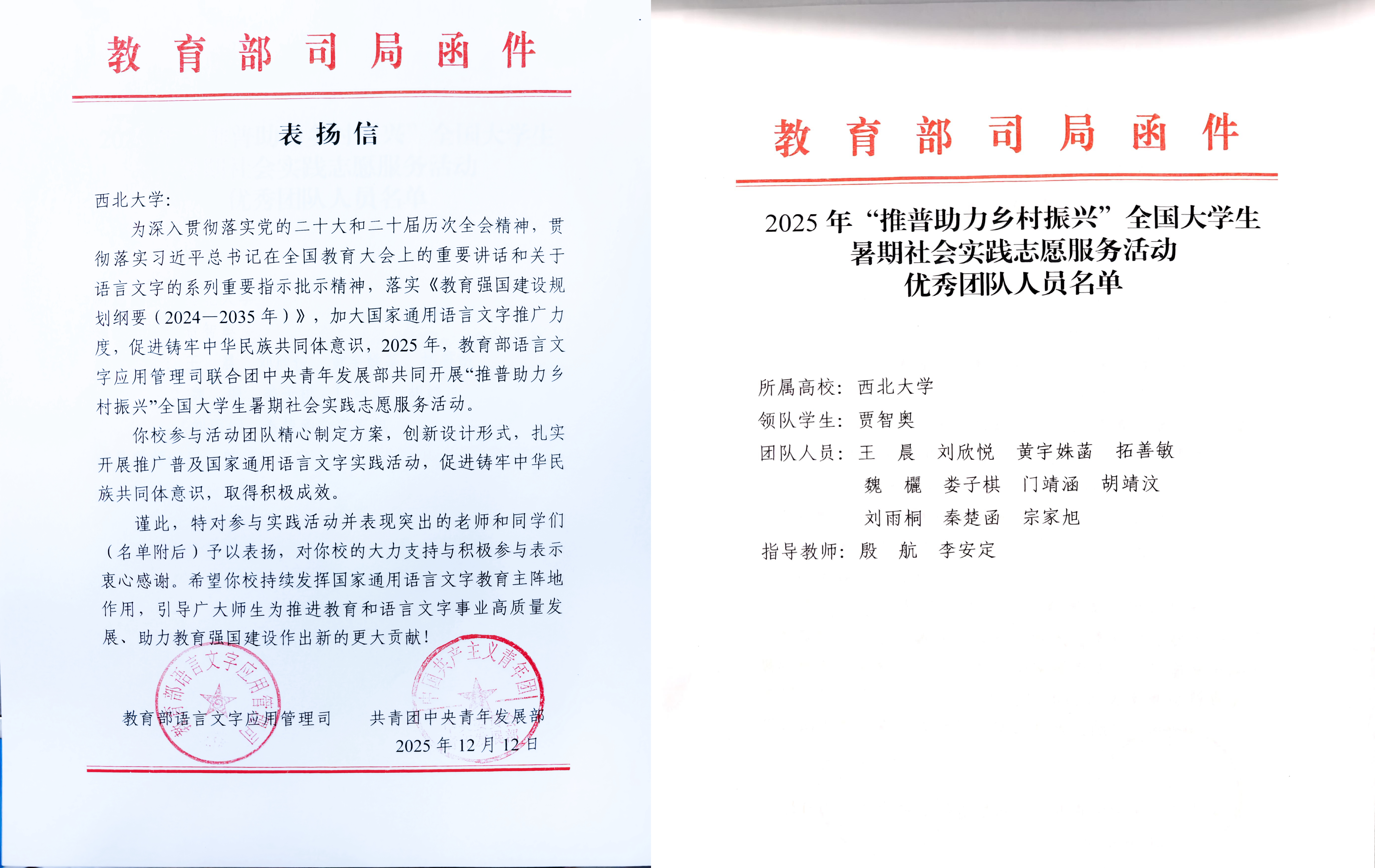 近日,在由教育部语言文字应用管理司、共青团中央青年发展部组织开展的2025年“推普助力乡村振兴”全国大学生暑期社会实践志愿服务活动中,由我院播音与主持艺术专业师生组建而成的“启声·经典润乡土”乡村振兴志愿服务团,从活动的1000支全国重点团队和1000支参与协同团队中脱颖而出,获评“优秀团队”。教育部语言文字应用管理司和共青团中央青年发展部向我校致表扬信,信中对团队师生的突出表现予以表扬,充分肯定了我校推广普及国家通用语言文字,促进铸牢中华民族共同体意识,取得的积极成效。据悉,这已是“启声”团队第二次获两部委表彰。