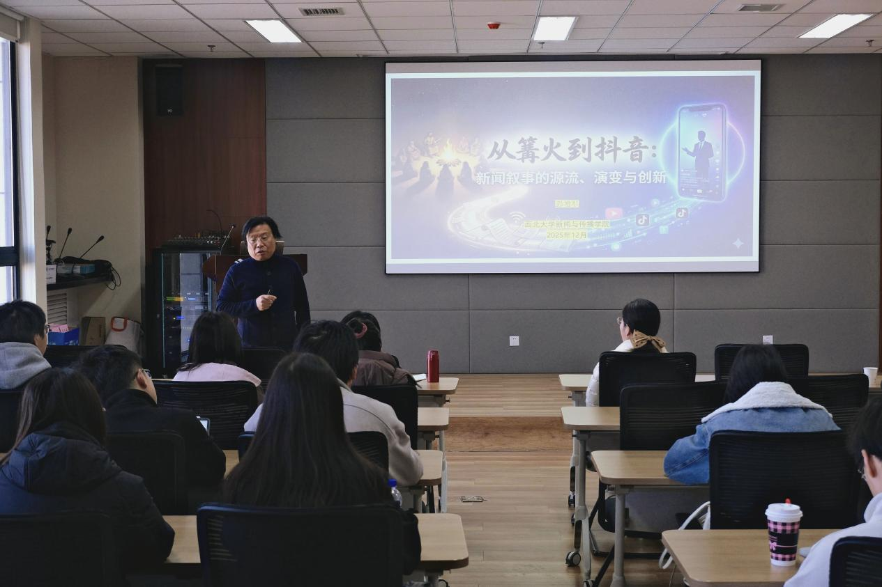 2025年12月25日上午10:10,美国圣克劳德州立大学(St.Cloud State University)大众传播与电影系教授、国际华莱坞电影学会(World Huallywood Academy)理事长彭增军应邀做客bv伟德国际1946,为师生作题为“回到未来:新闻叙事范式的源流、演变与创新”的学术讲座。讲座在东学楼9层北0901举行,由bv伟德国际1946李玮教授主持,学院师生到场聆听并参与交流。